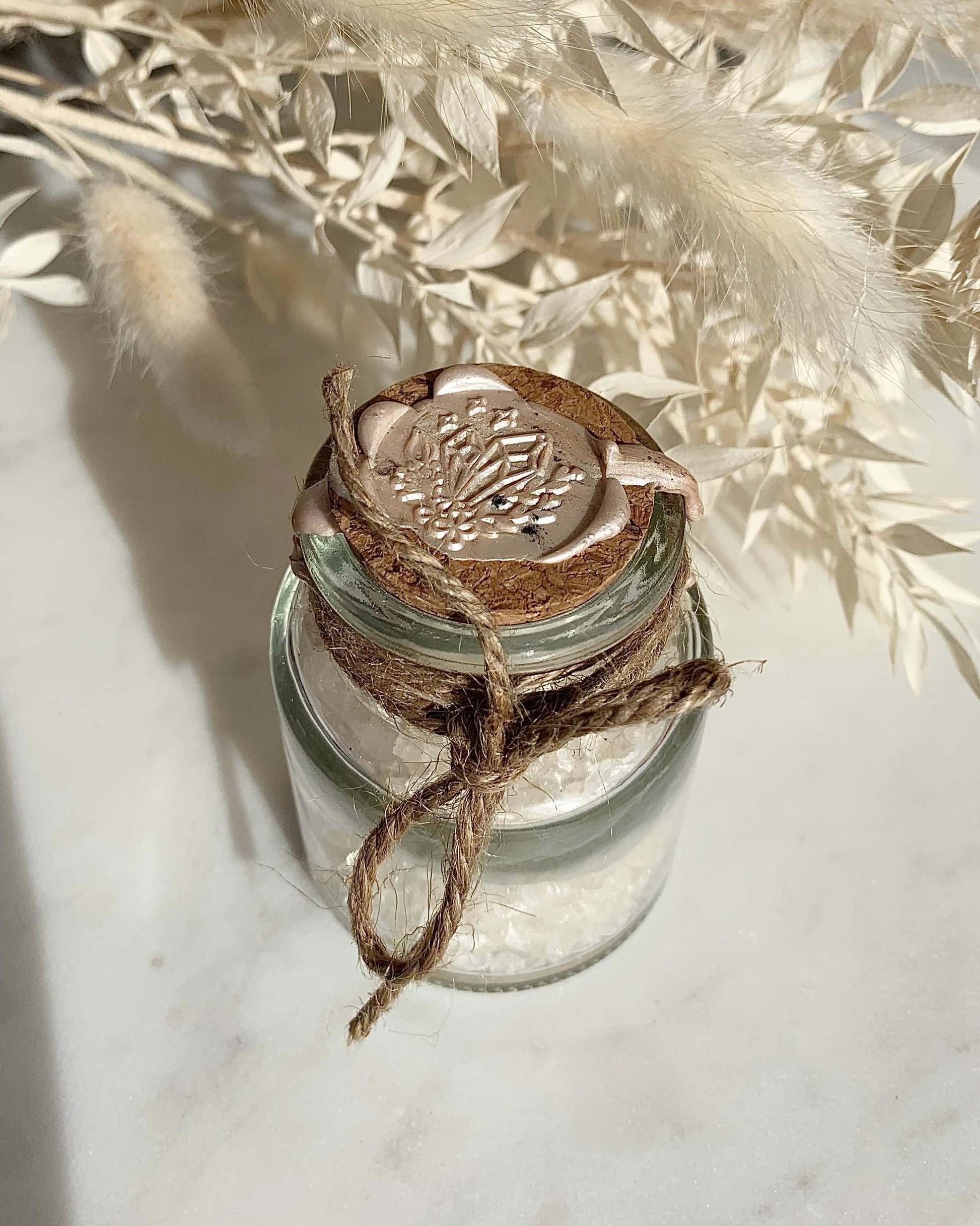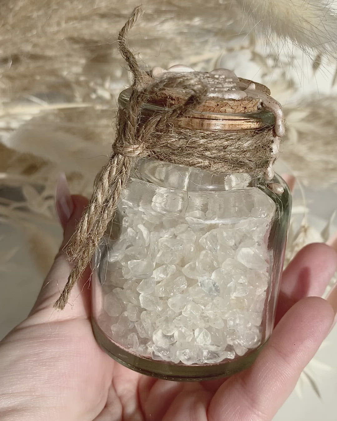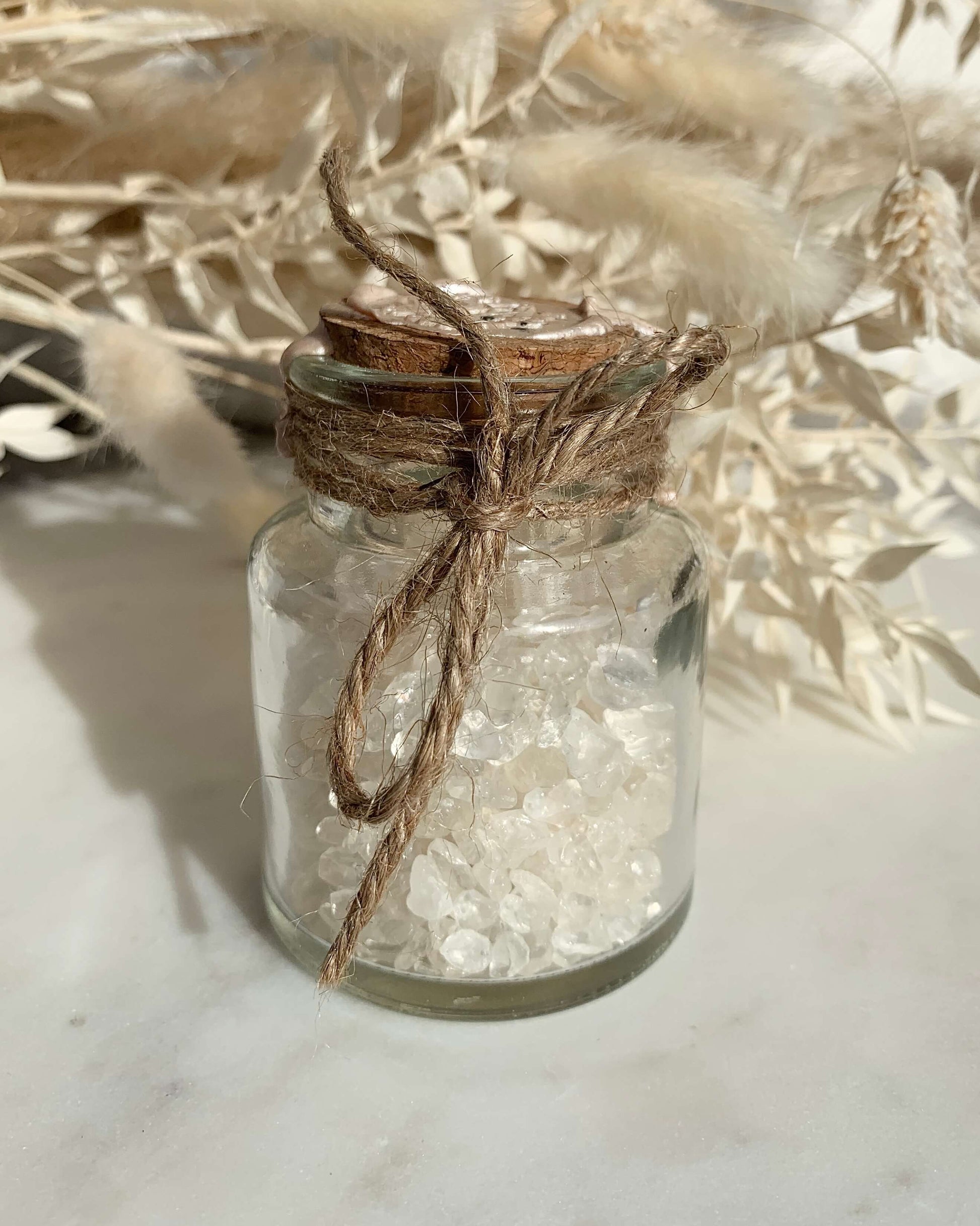 Hochqualitative Bergkristall- Ladesteinchen in einem wunderschönen, magischen und handverzierten Gläschen.
