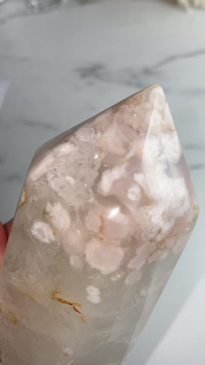 Wunderschöner, großer, funkelnder Blumenachat Turm mit Golden Healer Einschlüssen und viel Bergkristallanteil