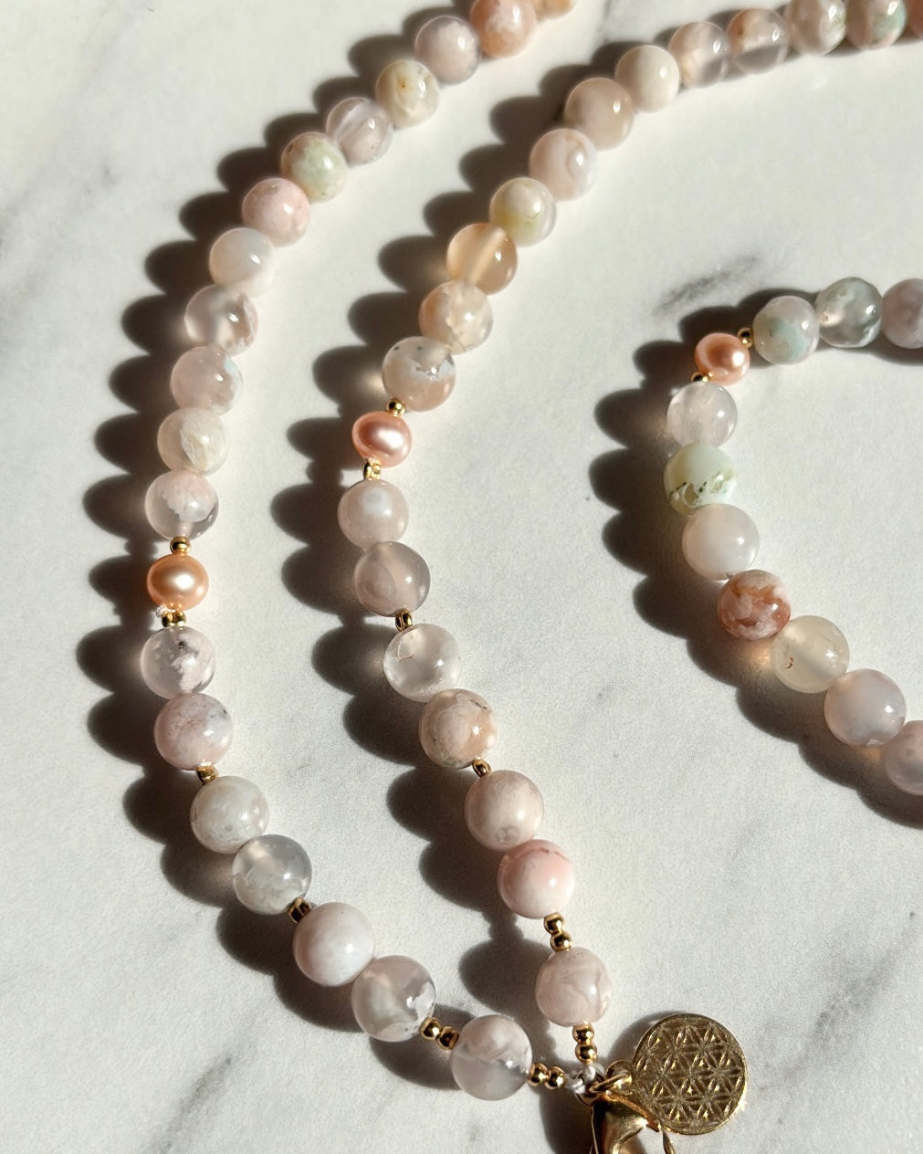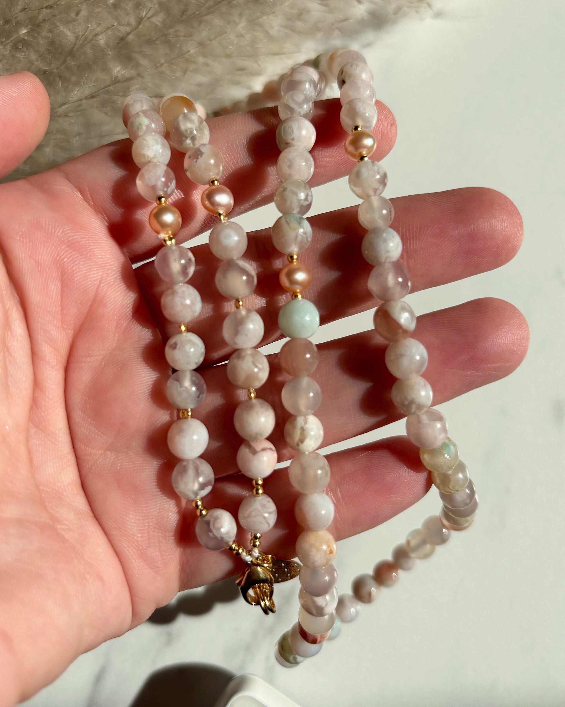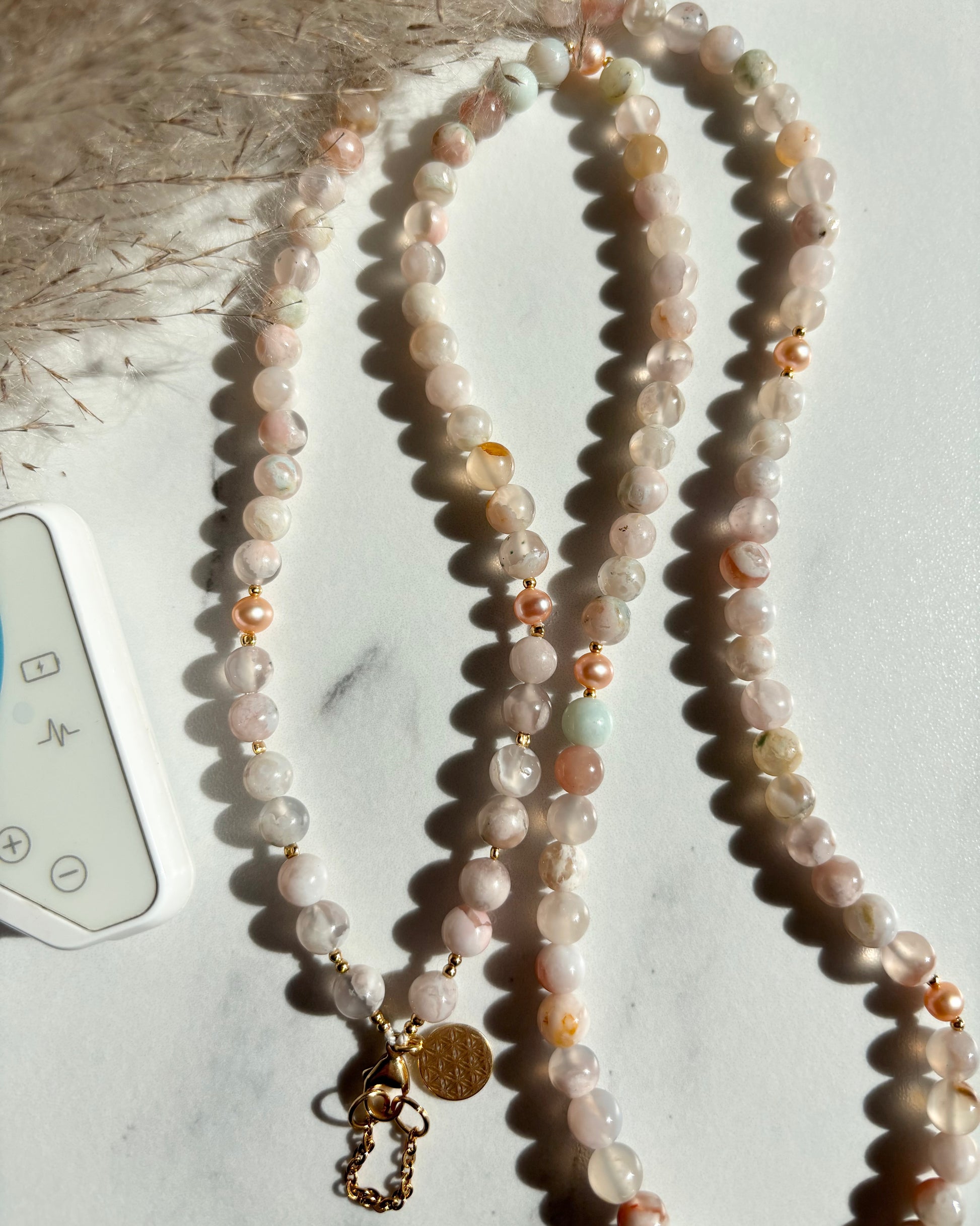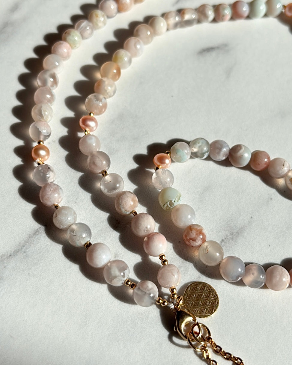 Kirschblütenachat, Pfirsichfarbene Süßwasserperlen