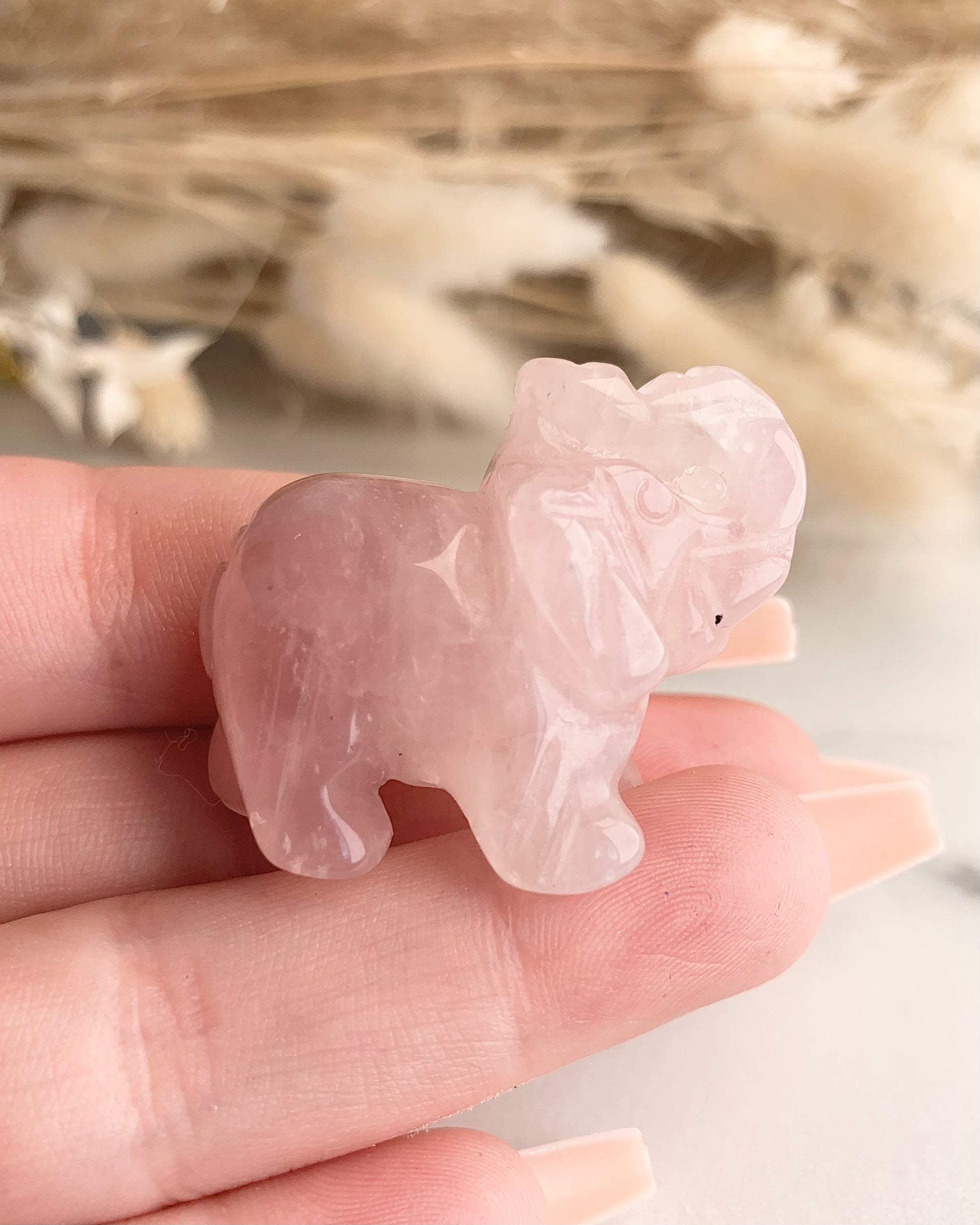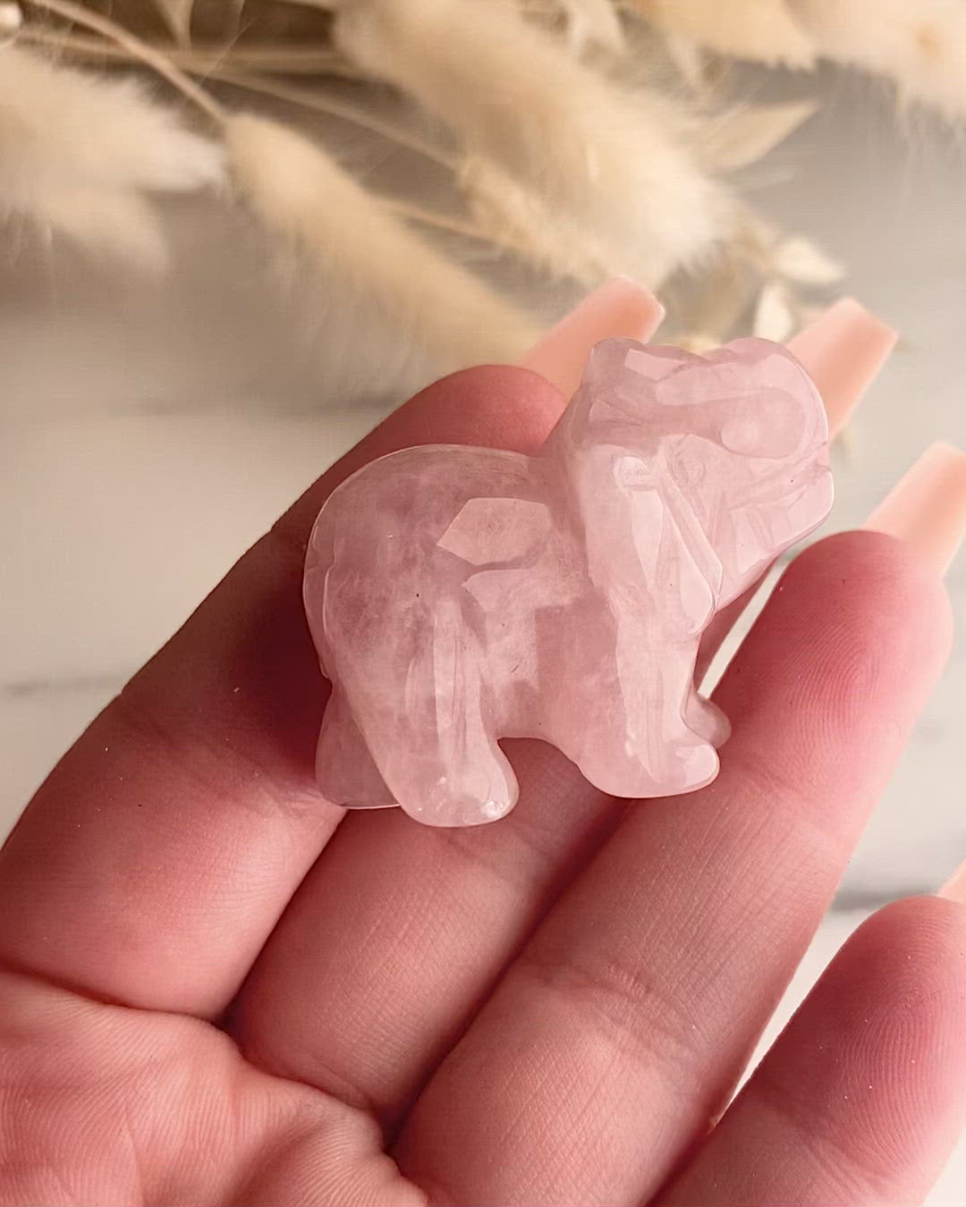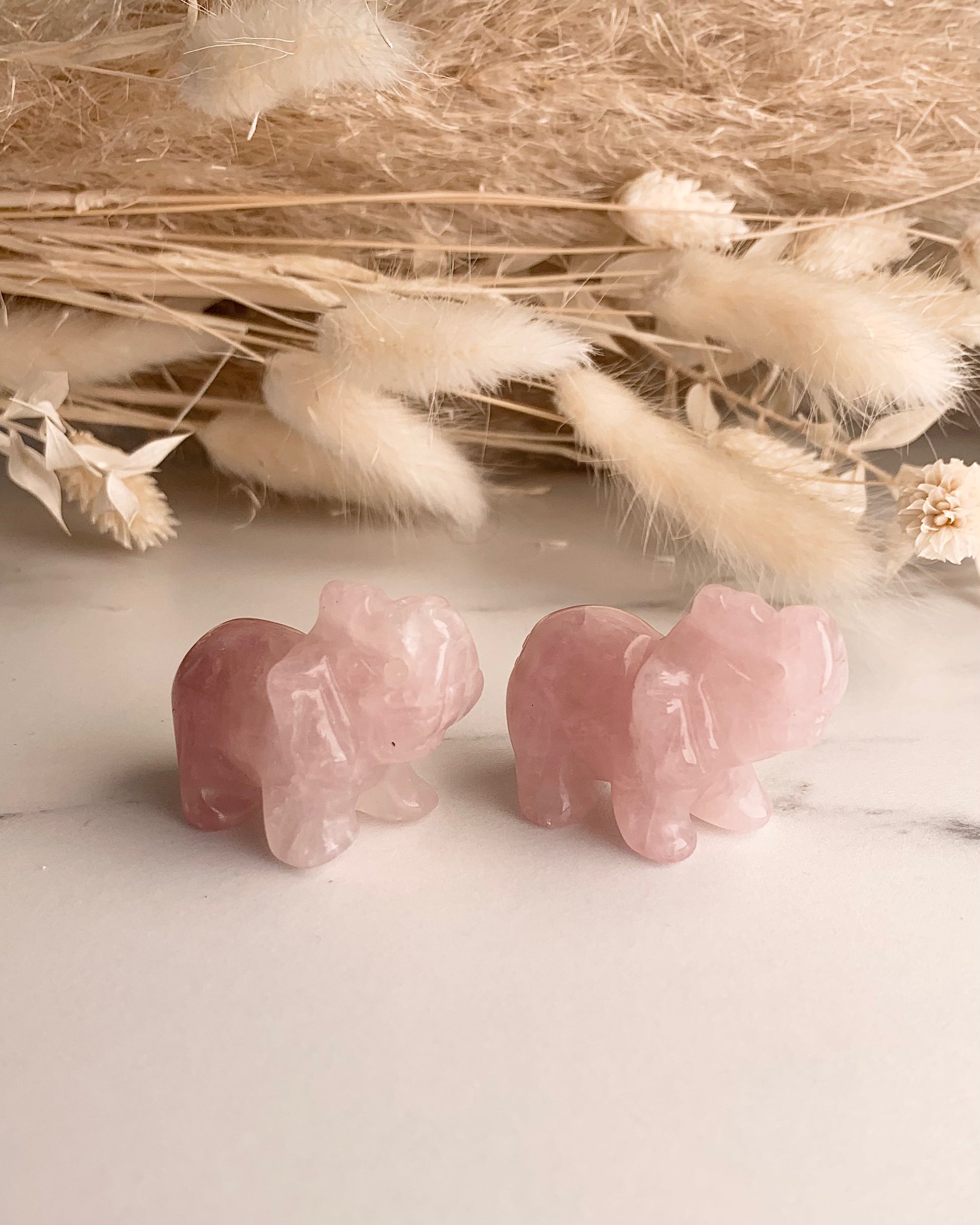Filigraner, handgecarvter Rosenquarz-Elefant. Einer von 3 Elefanten wird intuitiv nur für dich ausgewählt.