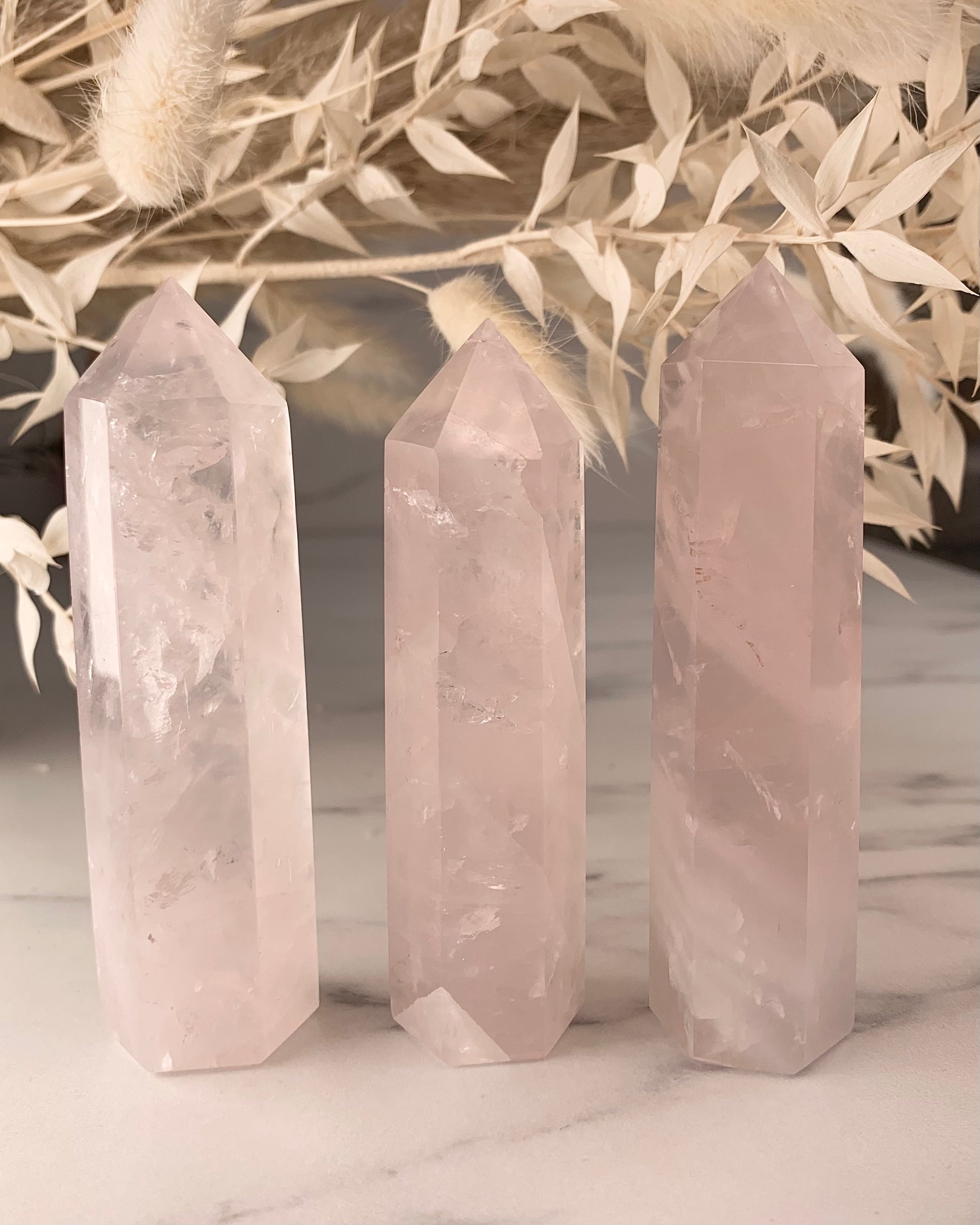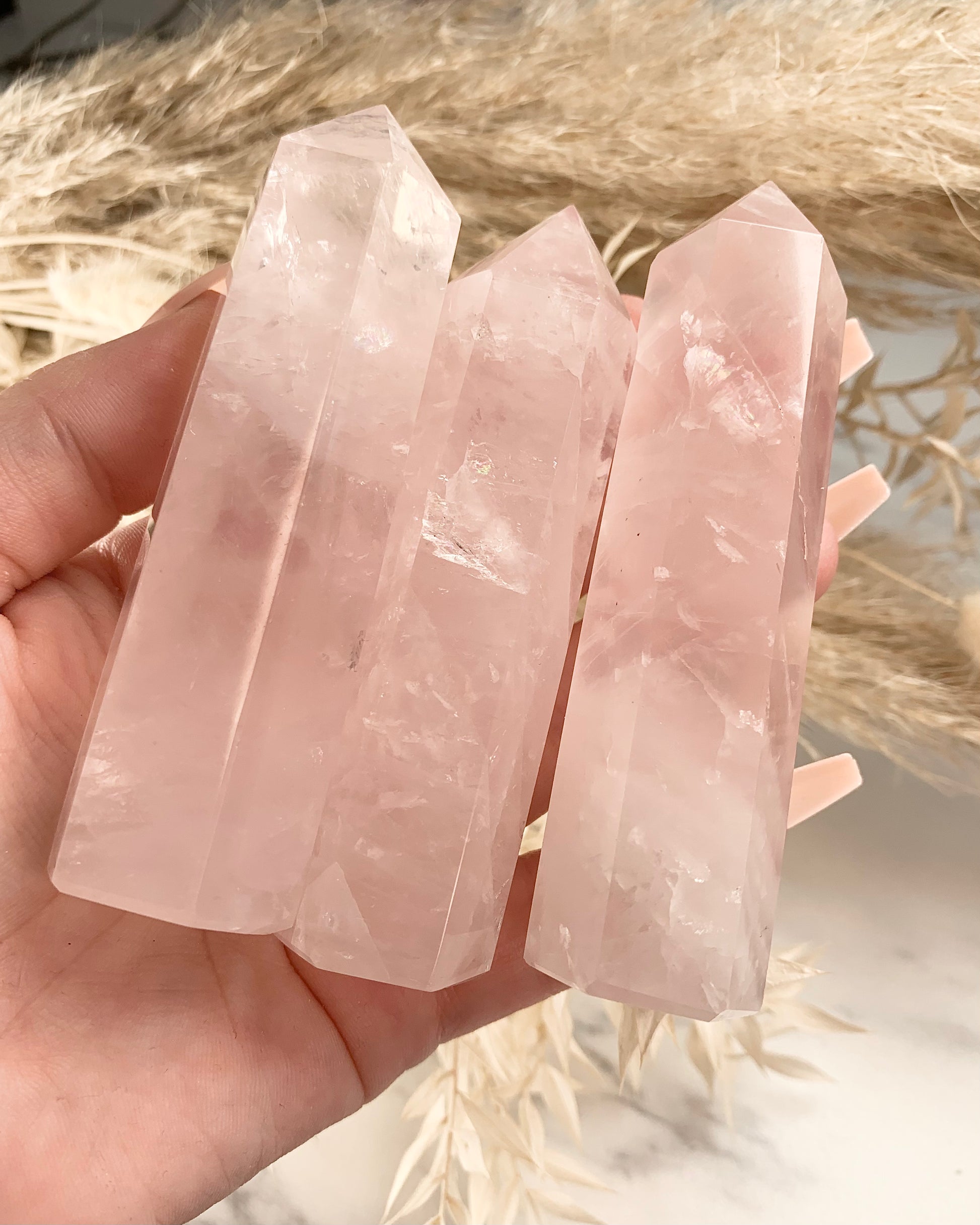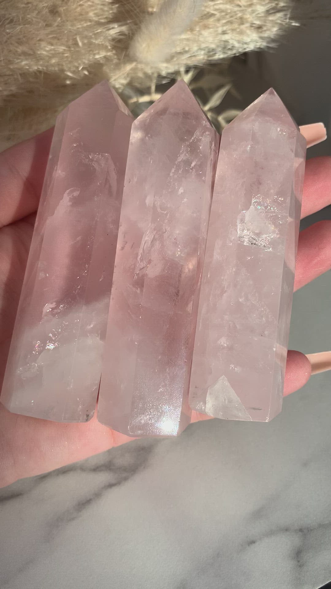 Wunderschön zarter Rosenquarz-Turm mit vielen schillernden Regenbögen. Wähle deinen Favorite aus links, mitte oder rechts.