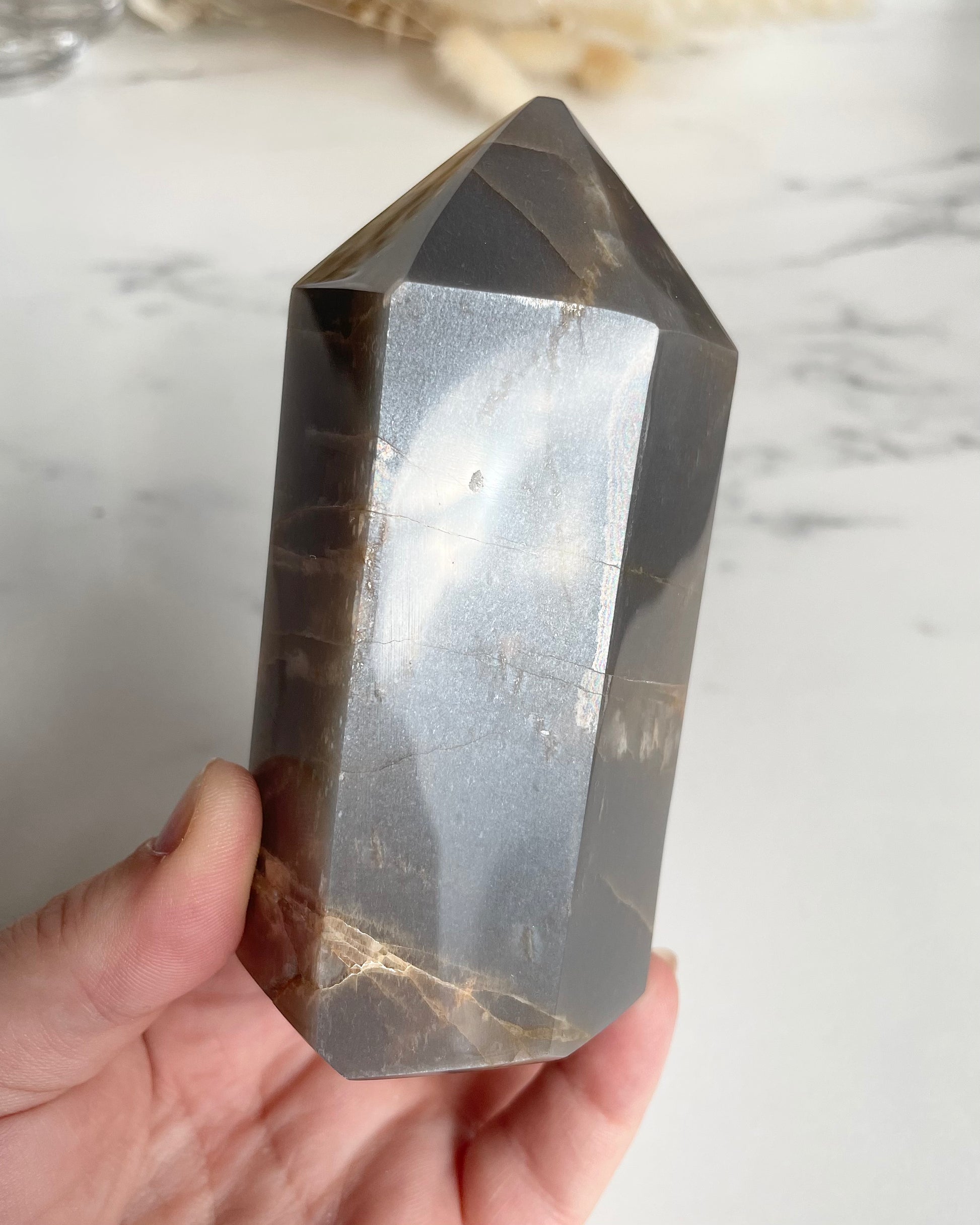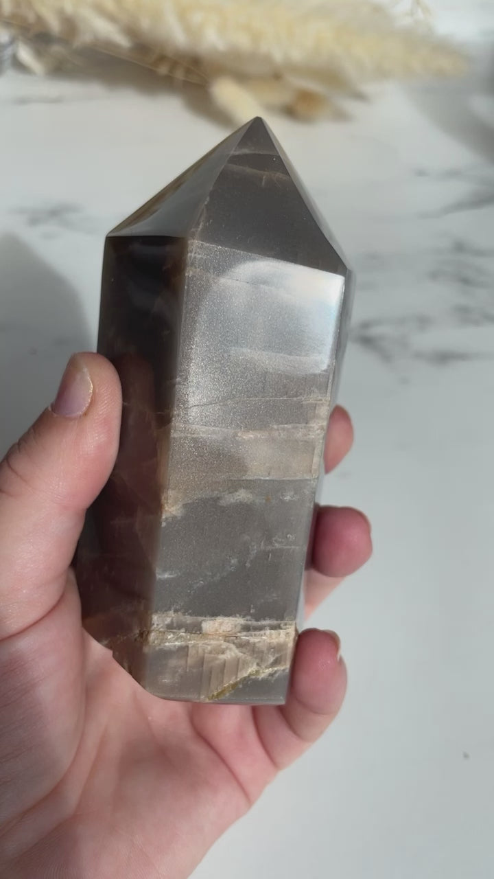 Flashy Black moonstone Spitze mit Sonnenstein-Anteil.