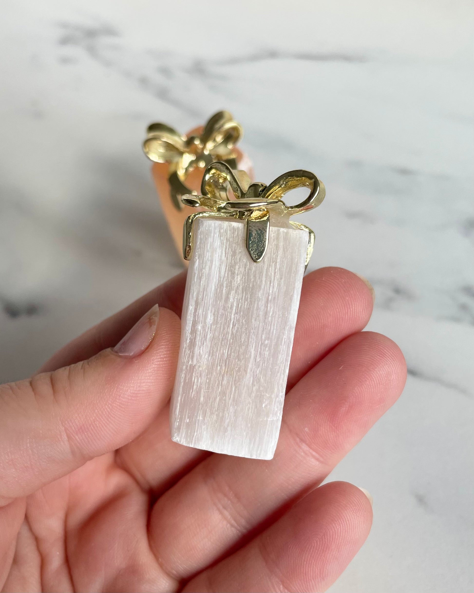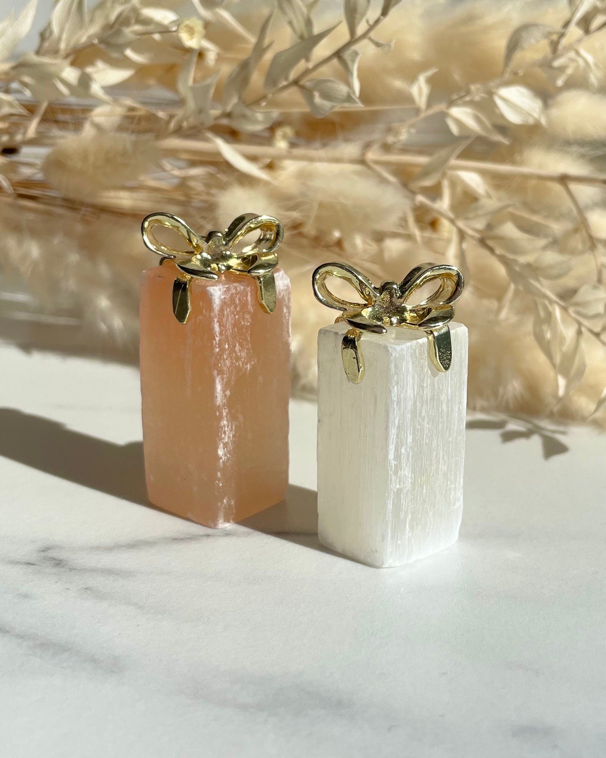 Zuckersüßes Geschenkpäckchen aus weißem oder Peachy Selenit mit goldener Schleife 🎁